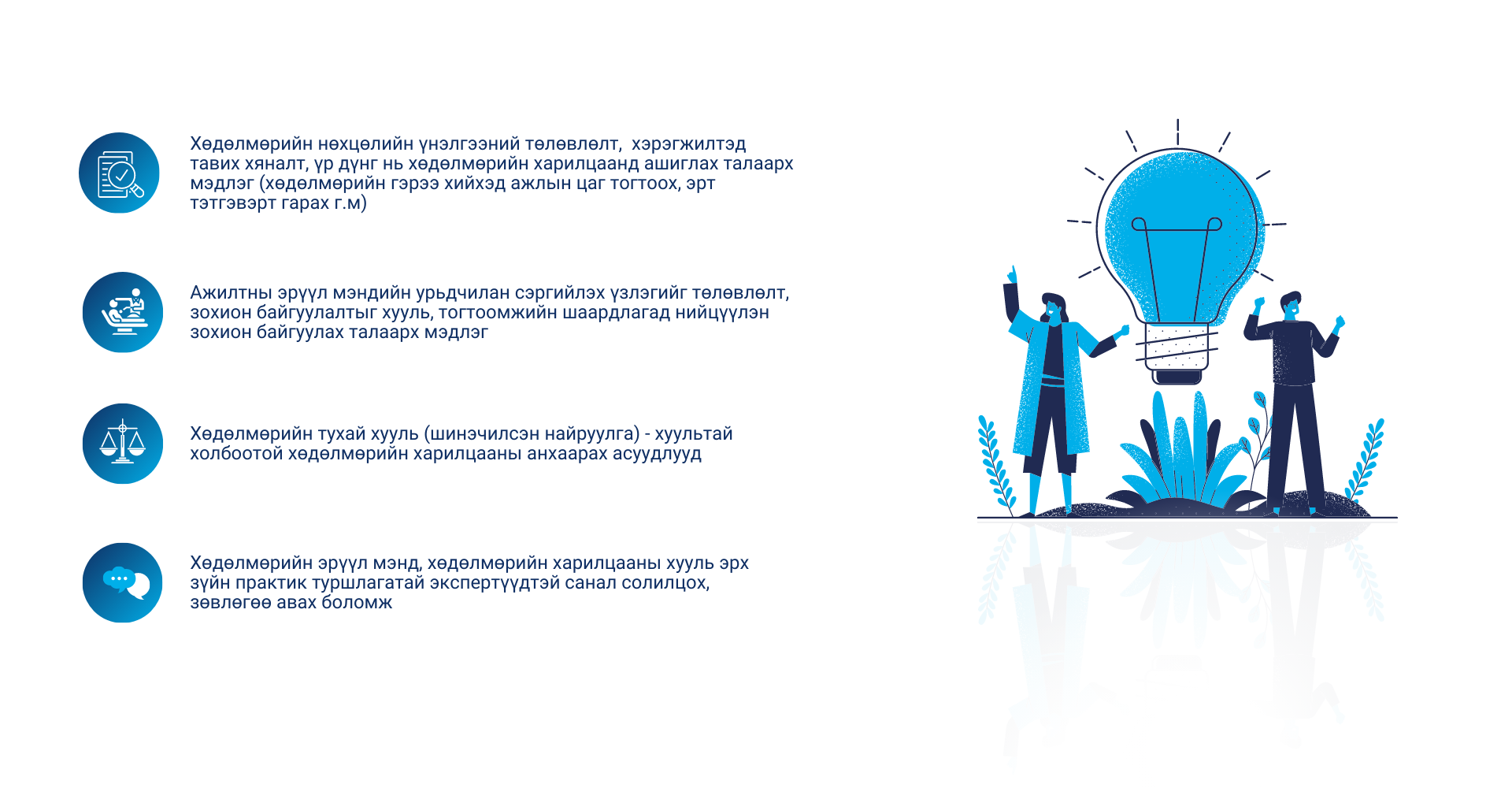 Байгууллагын удирдлага, хүний нөөцийн мэргэжилтнүүдэд хөдөлмөрийн нөхцөлийн үнэлгээ, ажилчдын эрүүл мэндийн үзлэгийг зохион байгуулахтай холбоотой хууль эрх зүйн болон хөдөлмөрийн эрүүл ахуйн мэргэжлийн мэдлэг олгох, нийтлэг тохиолддог асуудад зөвлөгөө өгөх зорилготой.